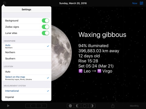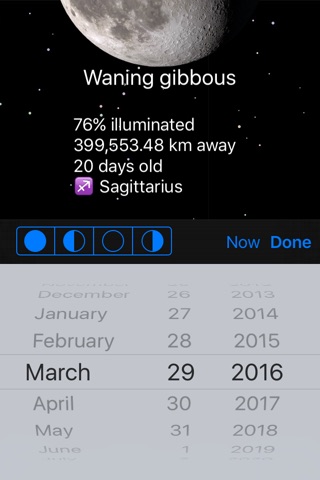 * Swipe left and right to move forward or backwards in time to see what the Moon will look like in the future or past.