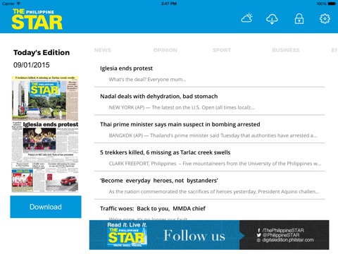 Everything you love about The Philippine STAR, the top source of news for Filipinos all over the world, can now be accessed on the tablet – from cover to cover. From our unbiased reportage of news and events, to the latest celebrity buzz, to the way we just know what trends are about to hit the streets, to the distinct voices of your favorite writers, editors and columnists – every swipe of your finger will be exactly like turning a page. Read, enjoy, and be informed anytime, anywhere. The Philippine STAR is a daily paper.