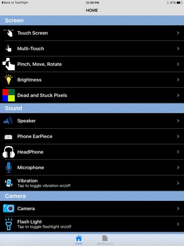 You’ll be able to check back/front Camera, turn on face detection switch to test if your camera correctly detects face. Also you’ll be able to check flashlight of your phone.