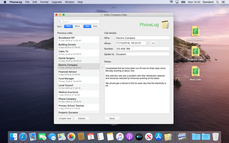 PhoneLog allows you to quickly store details about phone calls you have made - who you called, when you called and what was said on the call.