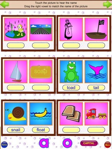 This app provides fun activities that introduce vowel sounds and their letter combinations. The activities will help kids identify long vowels. We have another application for the short vowels. Through the flash cards, matching, sound and signs, and silly sentences, the kids will receive lots of practice distinguishing between the different vowel sounds.