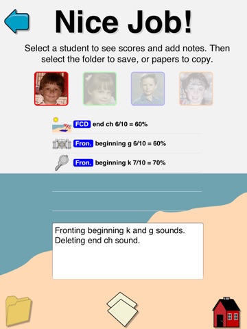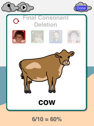 During the flashcard and matching activities, children practice by listening to the recorded audio, recording their voice to self-monitor, and collecting scores (aka data). Scores are collected only for the cards representing the target response. The scores are then saved in the app or exported with information regarding the phonological process practiced.