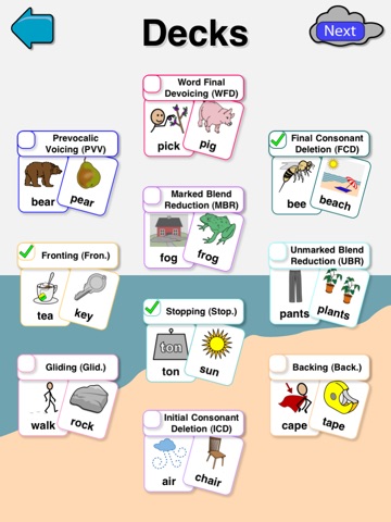 PhonoPix has 10 decks with 40 minimal pairs in each (400 total pairs) for the following phonological processes: prevocalic voicing, word final devoicing, final consonant deletion, fronting (palatal and velar), marked blend reduction, unmarked blend reduction, gliding (“l” and “r” sounds), stopping, backing (palatal and velar), and initial consonant deletion. Children view the minimal pairs in double-sided flashcards by flicking through an album and tapping an around button. In the matching activity, children have fun matching the minimal pairs in three different levels: easy with 3 pairs, medium with 6 pairs, and hard with 10 pairs.
