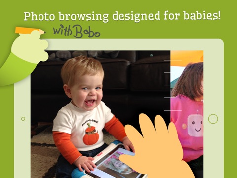 Photo Bobo is a photo browsing app designed especially for babies. Infants love to look at pictures of themselves and their families. Now, with the help of a mischievous little monkey, they can discover those familiar faces in an easy, safe, and fun app!