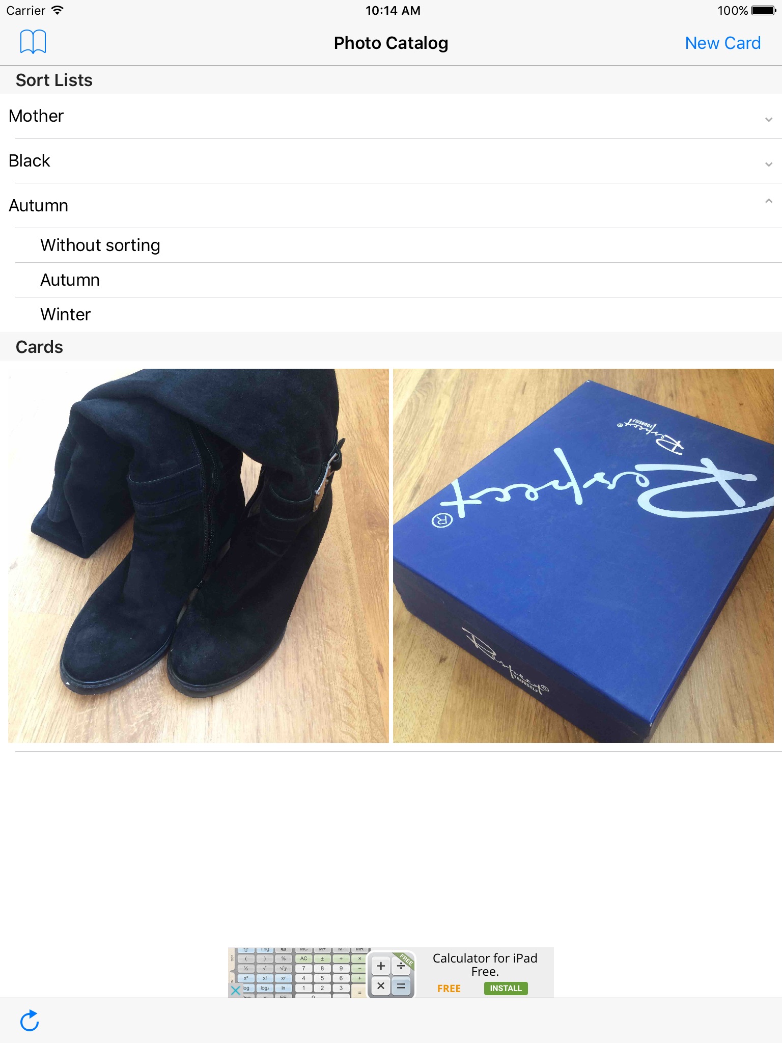 The "Photo Catalog" helps to solve the common problem of searching the packaged for keeping items such as shoes, clothes, tools, craft items, toys, dishes, etc. Сreate the base cards, fill in the cards with photos of items, their storage places and descriptions. You will find any items easily in the house with the help of a visual display cards.
