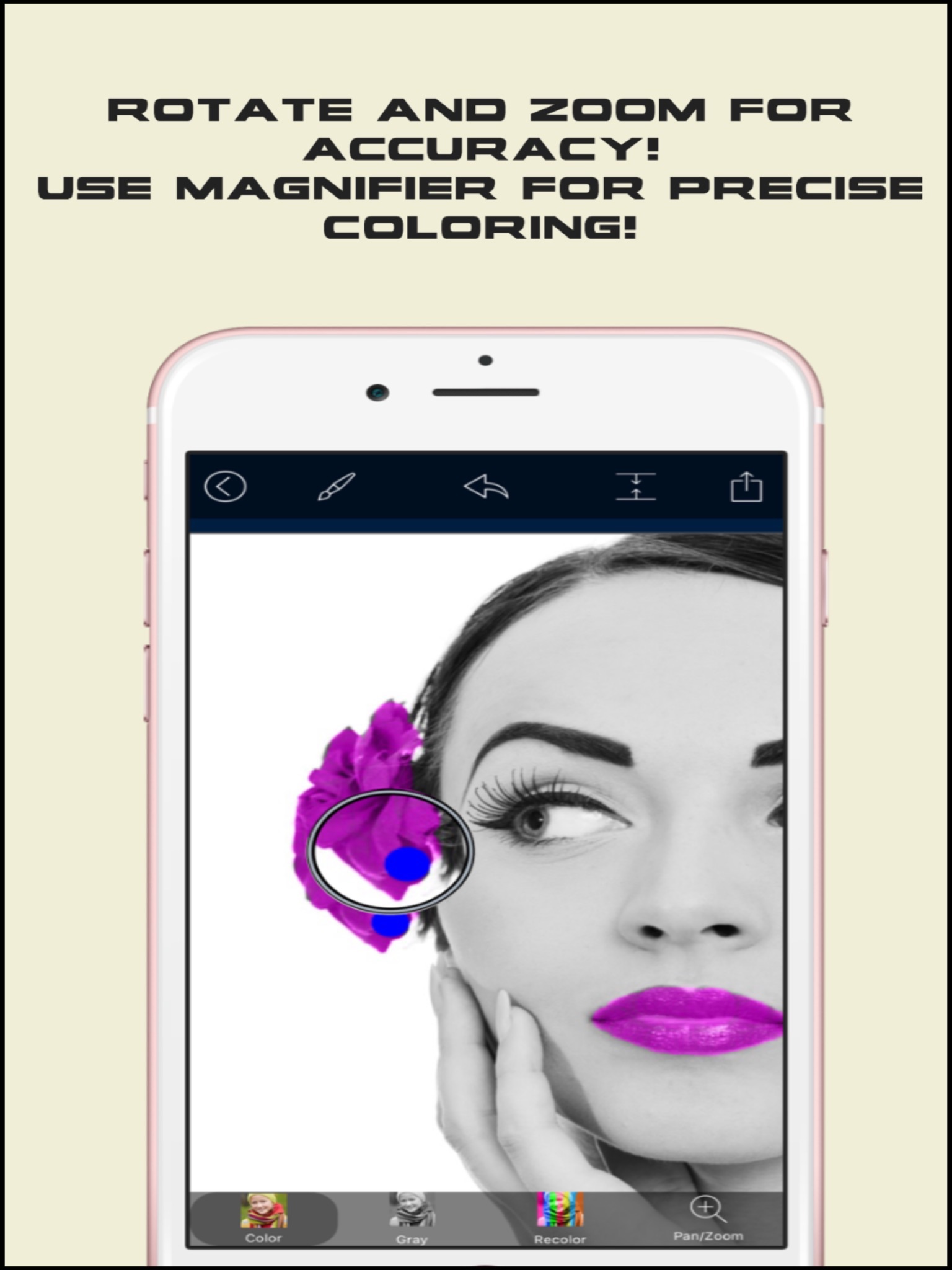 - Use the magnifier tool for accurate coloring.