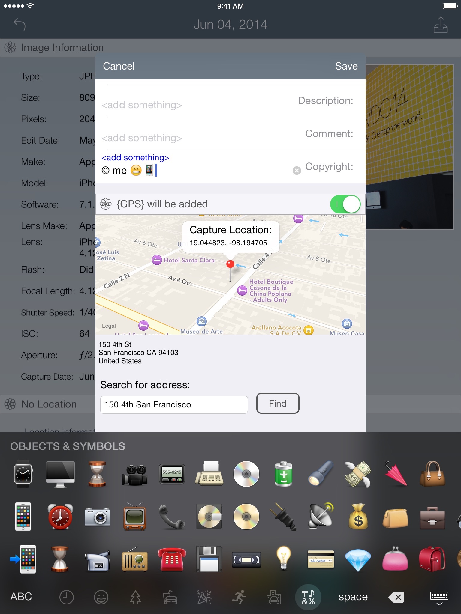 Have you ever taken a photo and the tagged address recorded was wrong, because of weak signal? Well now you have the ability add, edit, or remove. Note that GPS data will only be included if location services are enabled for the camera app in the iOS Privacy Settings.