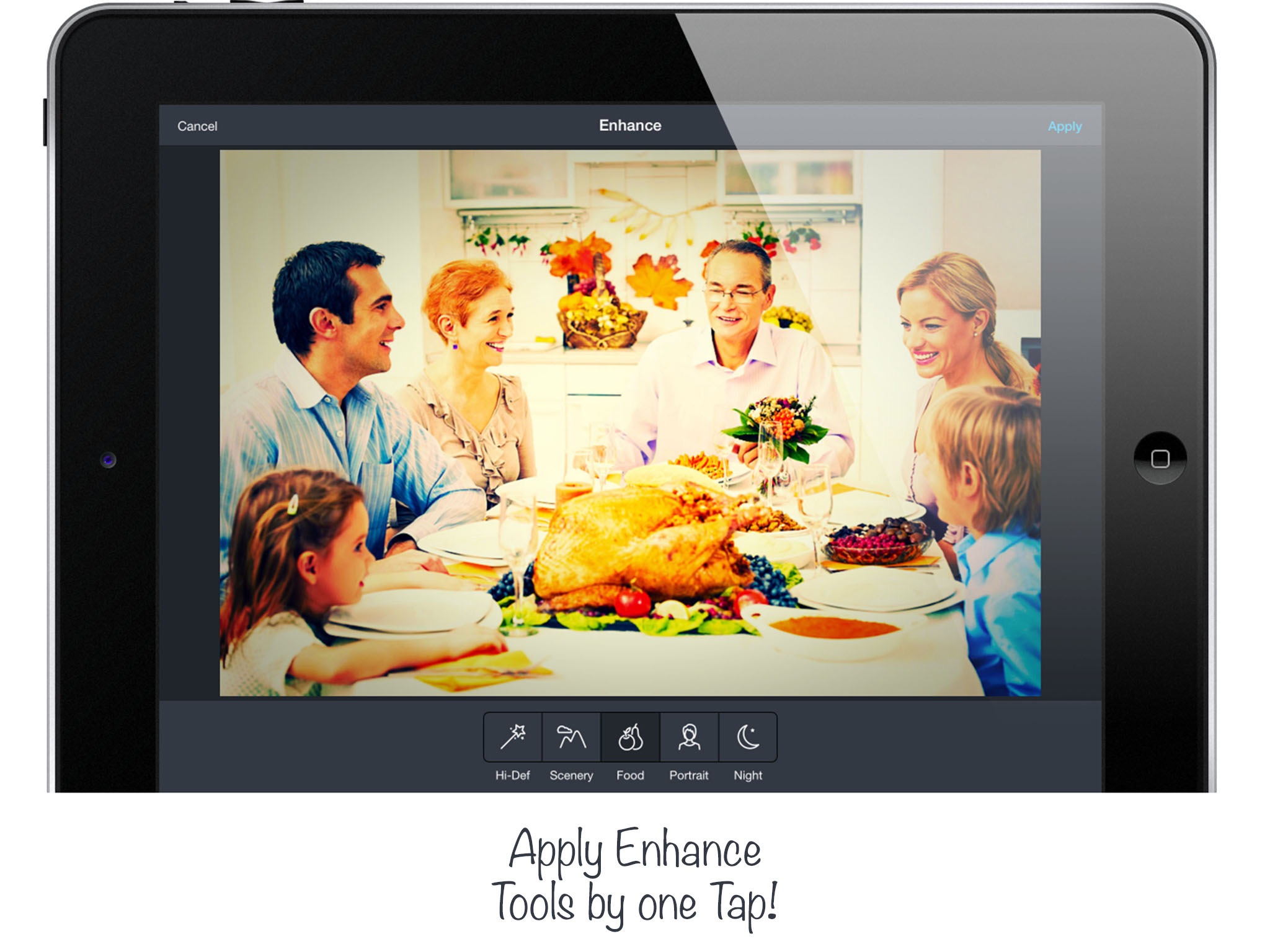 » Enhance with Hi-Def, Scenery, Food, Portrait, and Night.