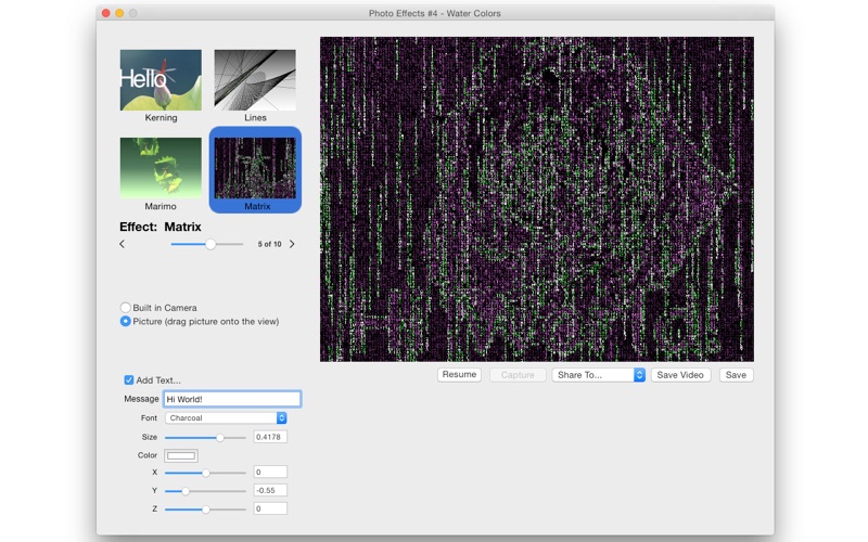 Turn any picture in to a work of digital art. Adds digital rain to your picture or a picture capture from your built in camera.