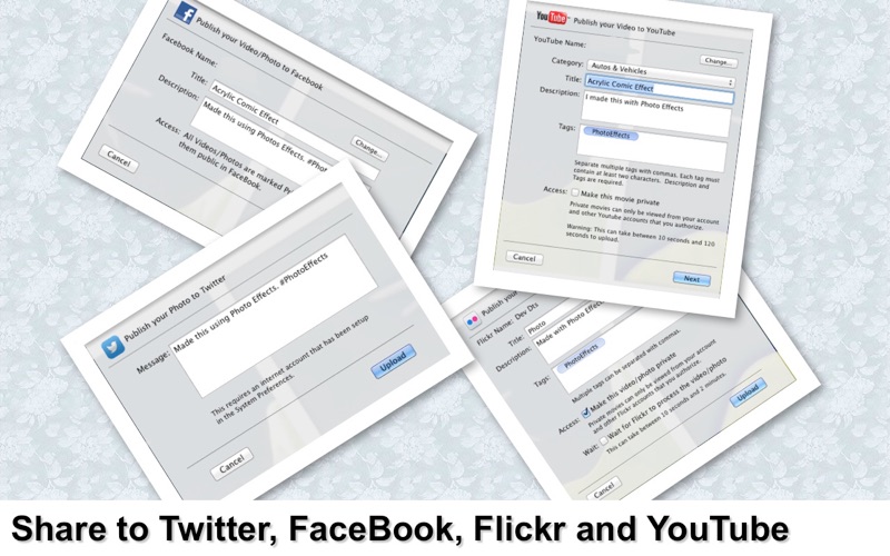 Easy to use. Just drag and drop your photo and select the effect. And its perfect for taking selfies by using the built in camera and uploading it to Facebook, Flicker, Twitter or YouTube . You can also make short video clips too.