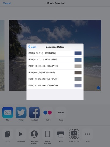 + Shows photos dominant colors, which you can copy/paste.
