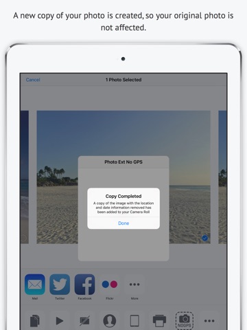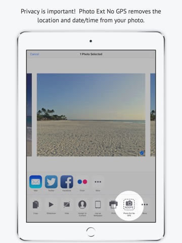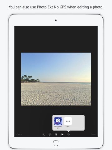 Photo Extension No GPS removes the location information and the date/time from the selected photo stored in the Apple Photos app for iPhone and iPad. This extension is great for photographers who do not want to include the location or date/time of the photo when sharing with clients or on social media.