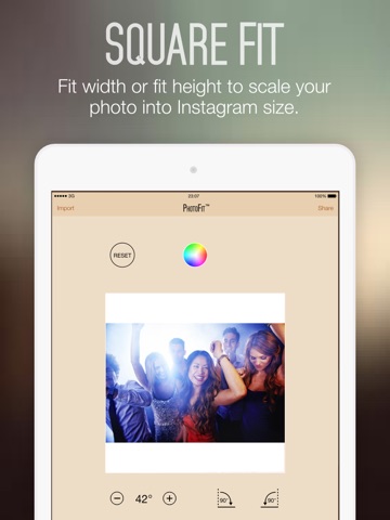 Fit Photo™ also offer you to custom scale of your photo by pinch and drag. You may also change the background of the photo with hundred of colors.