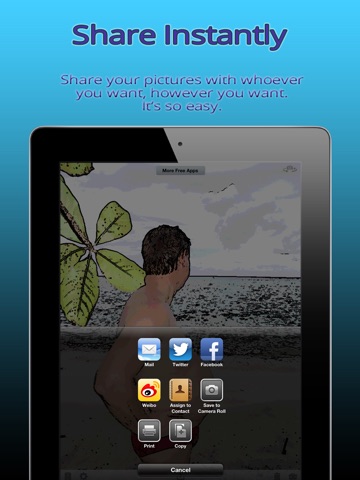 Upload your images to social sites and share them with your friends and family, just like photo booth but with more effects and social sharing.