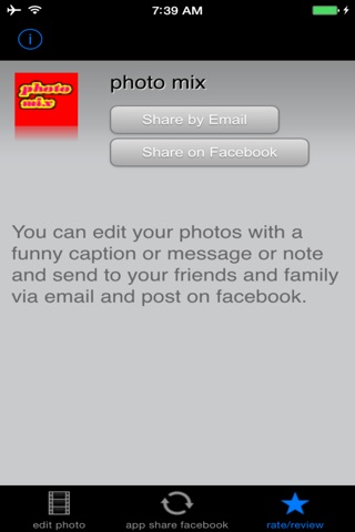 With Photo Mix Photo Fun you can add pictures and text to your photos. Use photos from your gallery or take new photos.