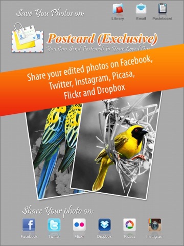 * Share your edited photos via Email, or on Facebook, Instagram, Twitter, Flickr, Picasa, Dropbox.