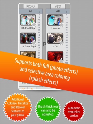 * Allows users to choose from and apply two separate sets of effects: Photo Effects (full picture), and Splash Effects (selective area).