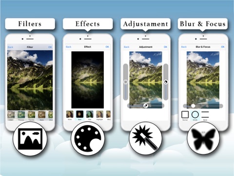 The Filter tool allows you to apply to your photos 13 High performance filters (Linear, Vignette, Instant, Process, Transfer, Sepia, Chrome, Fade, Curve, Tonal, Noir, Mono, Invert).