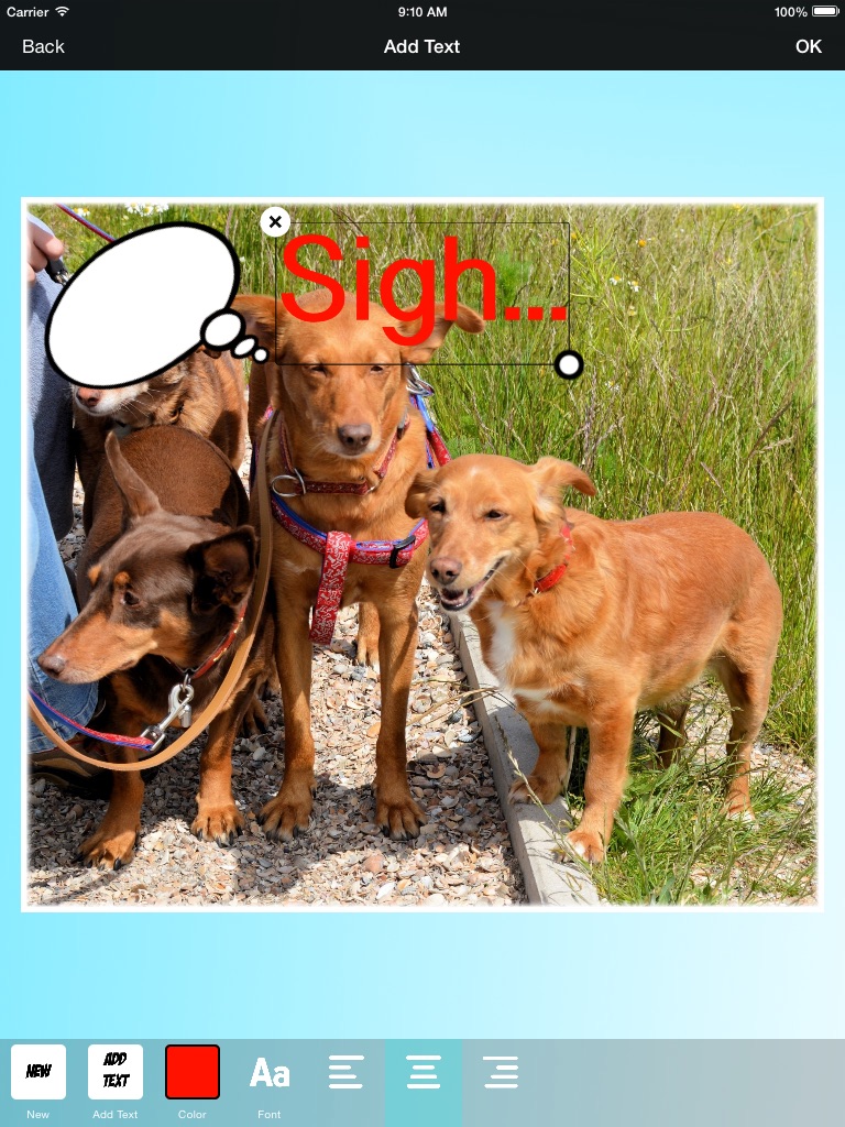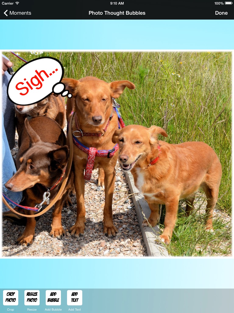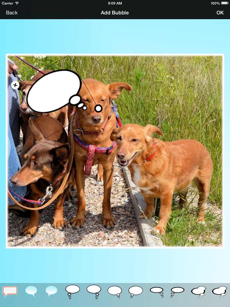 To use, simply select a photo from your library or take a picture from the app. You can then crop and resize your photo (if desired), and then add one of many different speech or thought bubbles. Finally, add the text and you are done! Save it to your library or share it to the world!
