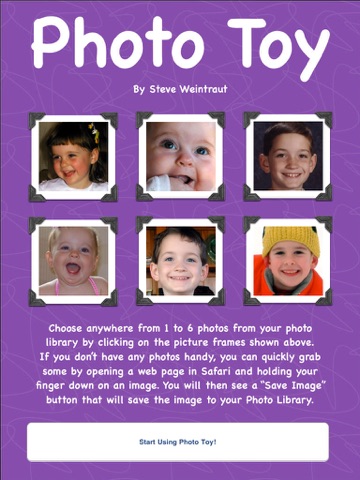 PhotoToy lets you play with your photos by applying them like stickers on top of a variety of 3D Shapes. You can tack your photos on top of cubes, pyramids, spheres and stars. You can then adjust their speed of rotation, size, and movement. You can add multiple shapes at once, and stack them on top of each other, or have them bounce around on the screen each having their own separate paths. You can shake your iphone to shuffle them around, click on one to edit its settings, or drag it around into a new position. You can also take a snapshot of your creation and save it to your photo library, and PhotoToy is smart enough to remember your creation so you can continue working on it the next time you open it up.