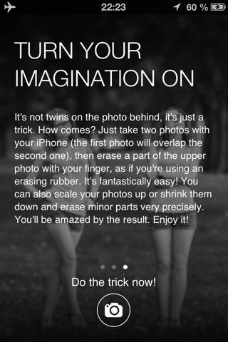 How comes? Just take two photos with your iPhone (the first photo will overlap the second one), then erase a part of the upper photo with your finger, as if youre using an erasing rubber. Its fantastically easy! You can also scale your photos up or shrink them down and erase minor parts very precisely. Youll be amazed by the result. Enjoy it!