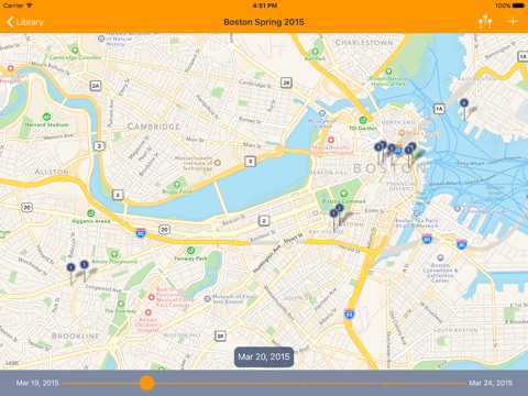 Tap the atlas cover to open the atlas. The entire screen fills with a map. The slider at the bottom is the timeline for that atlas. Simply slide the orange dot to change the dates and watch the pins change.