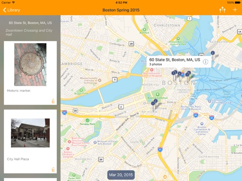 For iPads, a strip appears on one side of the screen with all of the photos and videos for that pin. For iPhones, the strip pushes on top of the map. You can tap on the captions to edit them or tap the photo or video itself to view it fullscreen.