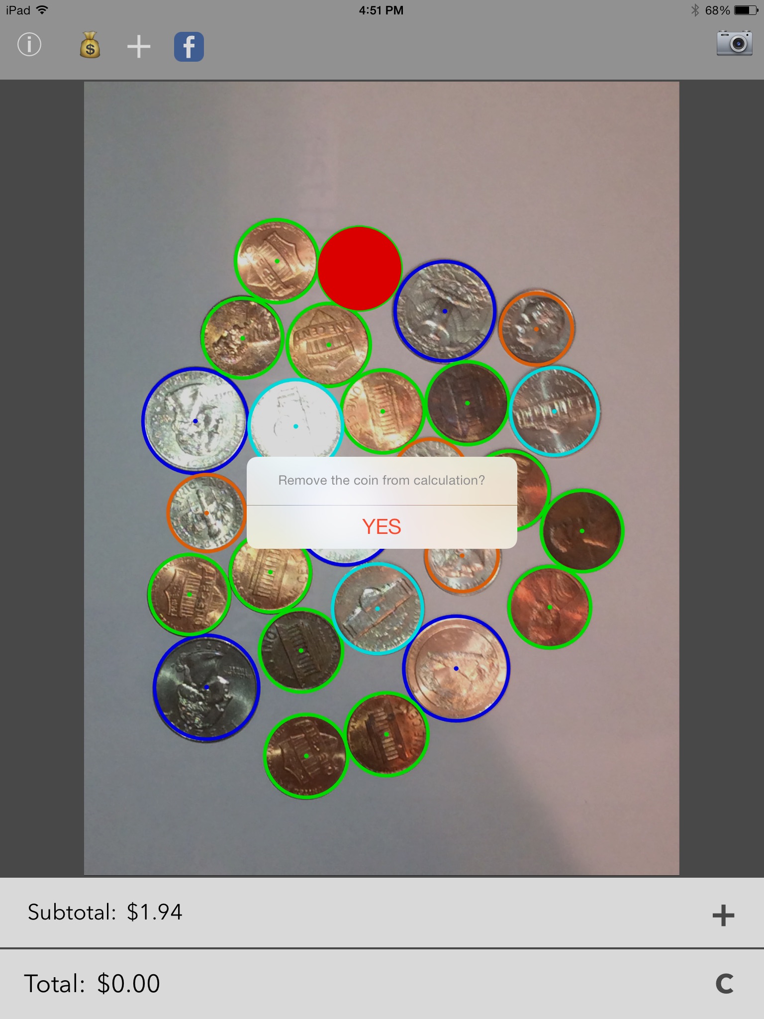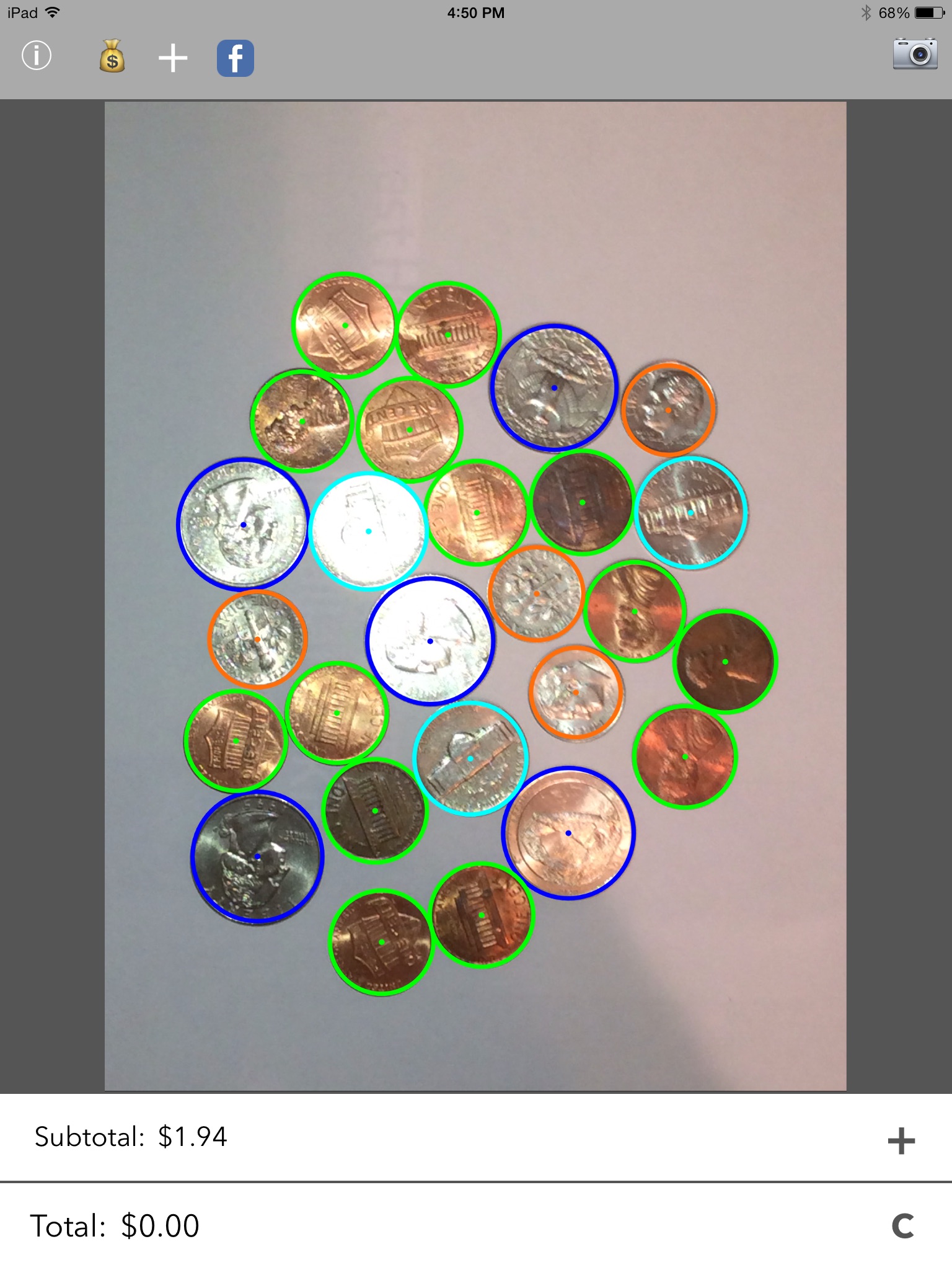 Calculate the total money in a pile of mixed coins by taking a photo of them with Photocoin!