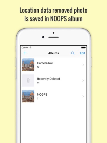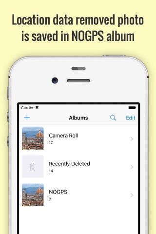 * Location data removed photo is saved in special photo album. Original photo is untouched.
