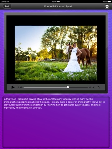We are glad to perform our new application about photography. Watching these videos you will learn how to make good wedding photos, self portraits, photos of landscapes, etc. This course is an effective way to start learning the art of photography and who knows may be you will become a famous photographer?