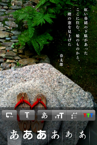 photoikku IWATA is a new application that lets you place "haiku" or "senryu" or "tanka" over an image to create a new form of poetry. The major feature is a bundle of six typefaces from Iwata. Iwata is one of the most traditional and reliable font bender.