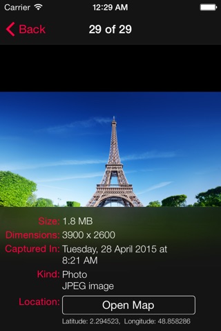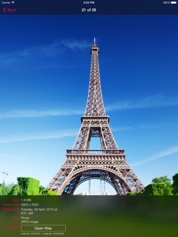 Have you needed to know the properties of photos and videos in your album? PhotoInfo can show you: Size, Dimensions, Capturing Date and Location in the Map for each photo and video in your album.
