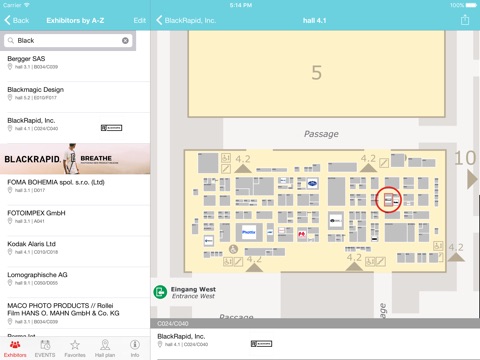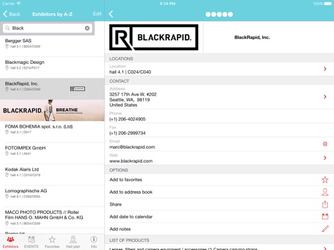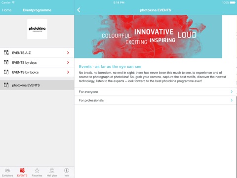 Find exhibitors by name, country and product groups and plan your visits with favourites, contacts, appointments and notes. Get information about the program of the photokina. Keep track of interesting program dates with favourites to program dates.