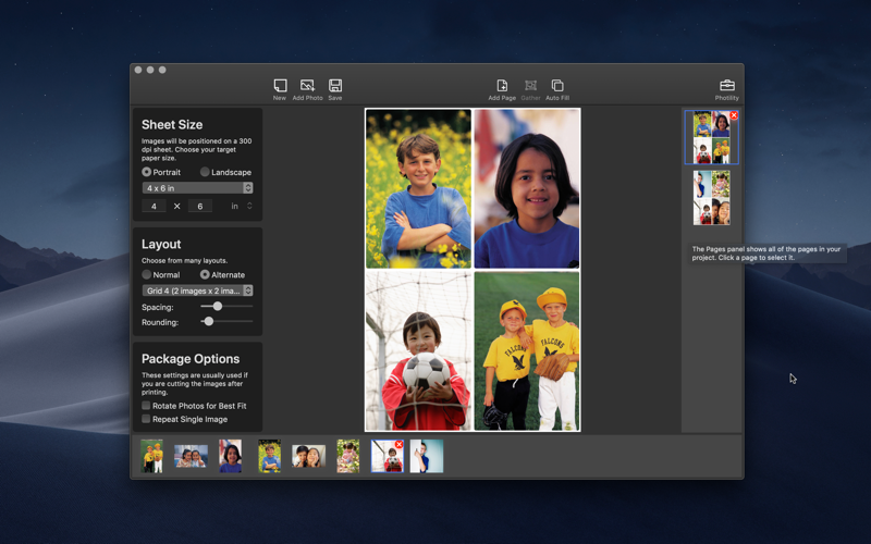 • The film strip holds all of the photos youre working with, and page views help you build multiple pages using the same layout! Create package prints for several photos at once!
