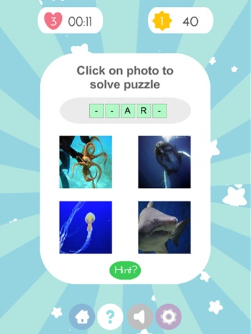 The object of the game is to solve a word puzzle by clicking on the correct photo. Puzzles consist of one or more words represented by mostly blank spaces, and sometimes a few letters filled in. By analyzing the number of letters in the puzzle and whatever given letters are displayed, the player must figure out which of the four photos matches the puzzle.