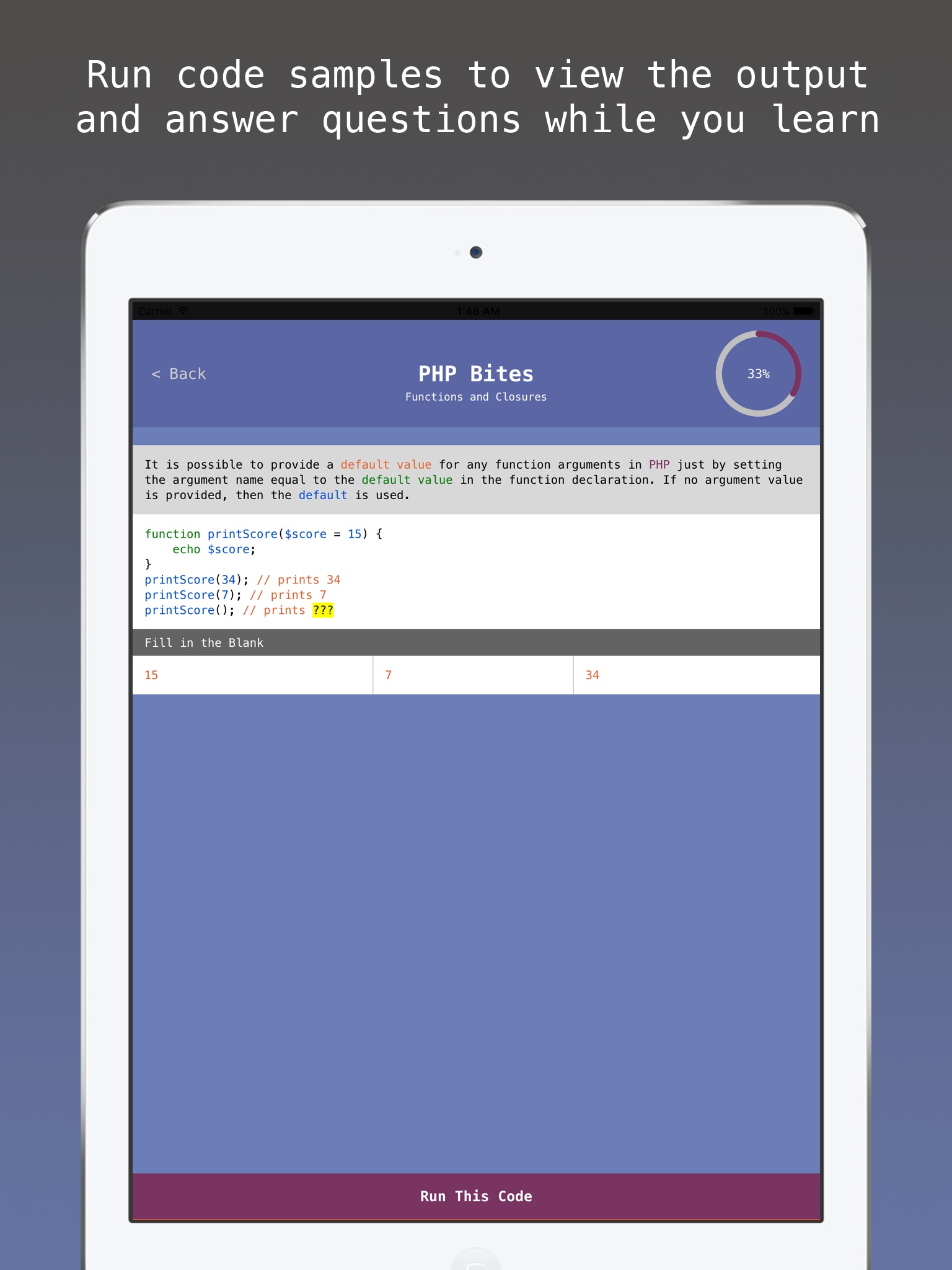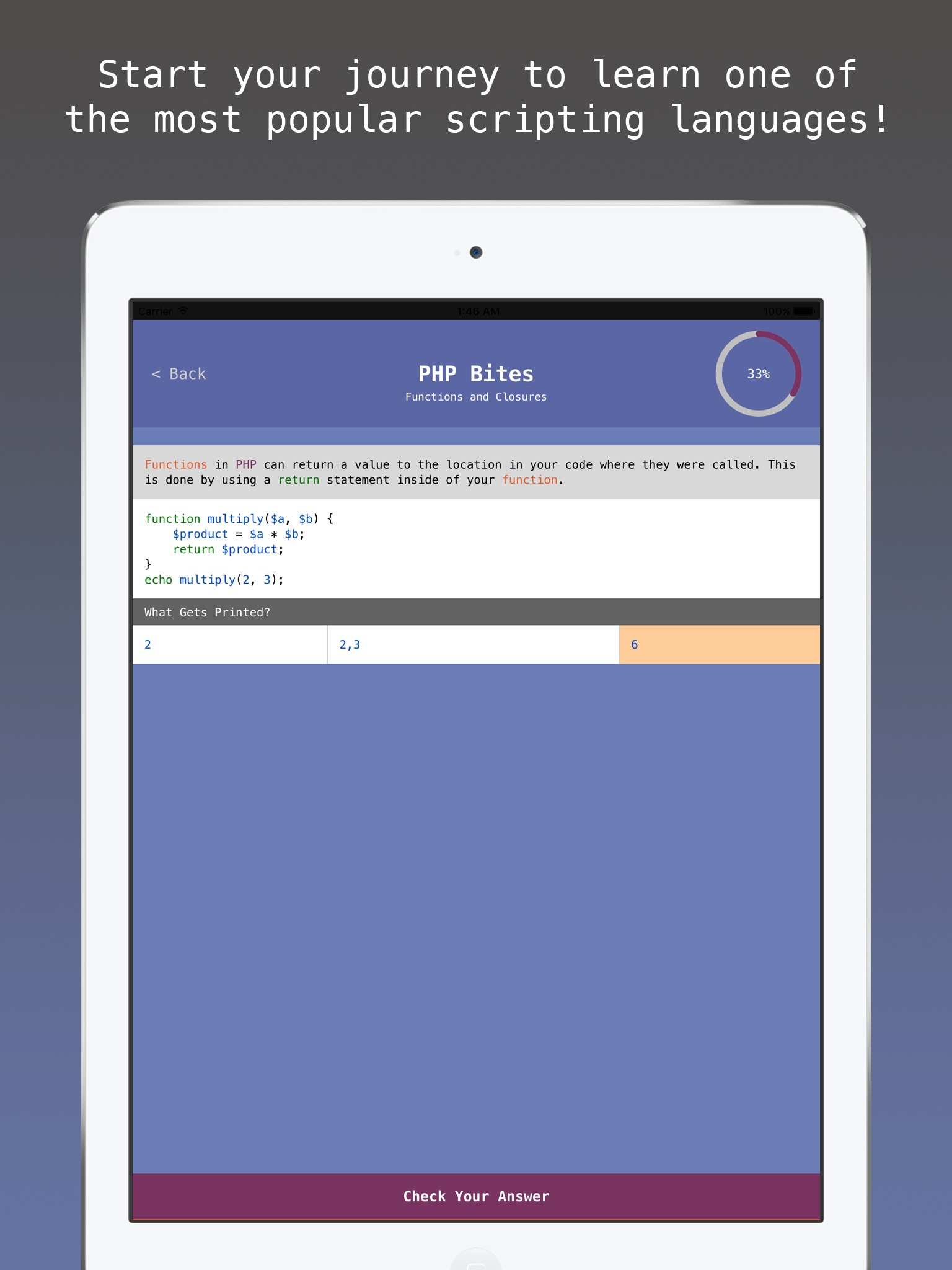 Learn how to code in PHP while youre on the go! Whether youre a complete beginner or experienced developer looking to learn one of the most popular web scripting languages, PHP Bites will teach you the basics of PHP and get you started on this awesome learning adventure. Youll even get awarded a nifty little certificate for completing the entire mini-course! :)