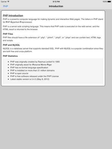 The PHP properties/functions are categorized and searchable. Each detailed information screen contains a description, syntax, parameters, examples, and more. In addition, most of the examples include the actual output.