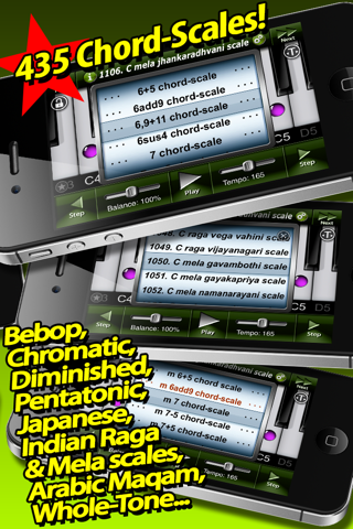 ● Encyclopedia of 435 scales (harmonic, melodic, diminished, hexatonic, whole tone, augmented, double harmonic, altered pentatonic, messiaen modes, indian raga & mela, arabic maqam), which can be transposed in any desired key (about 5,200 total scales incl. transposition!)