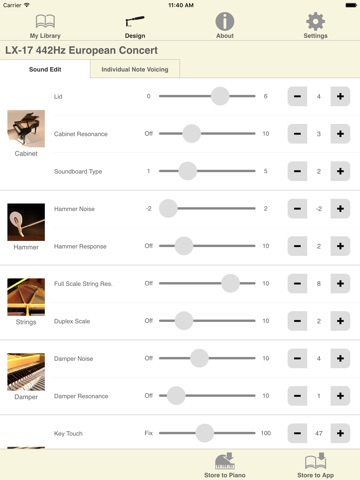- Parameters related to lid position, strings, and hammers are listed at a glance, and can be edited and transferred to the piano easily.