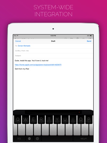 Piano Keyboard merges traditional qwerty keyboard together with a full scaled piano keyboard onto your iPhone / iPad. The experience is simply phenomenal.