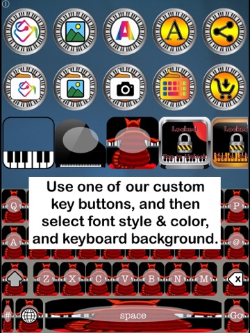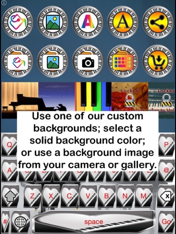Heres something noteworthy for all you treble-makers: Piano Keys enables you to customize your iOS keyboard, using our custom piano-themed buttons/keys, backgrounds and templates. Modify our templates by changing key colors, font styles and colors, and background colors, or upload a background image from your devices camera or gallery. Its simply grand!