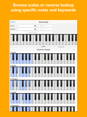 Easily navigate over 5000 root and scale combinations. Select all roots or a single one to browse the list of piano scales. Or choose the number of notes, specific notes on the keyboard and search keywords for a reverse lookup – all on a single screen. Quickly tap or swipe a scale to hear an ascending or descending arpeggio.