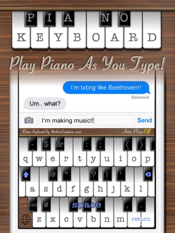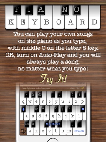 Play your own music as you type, with middle C being on the letter S key. OR, enable Auto-Play and you will always play a song, no matter what you type!