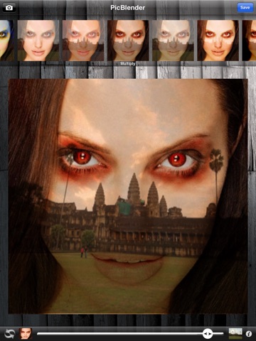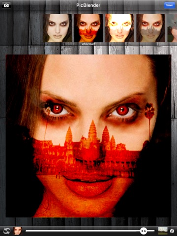 Just select 2 photos in your photo library and start blending them; choose a blending mode with the top scroll menu, and adjust the strength of the effect with bottom slider.
