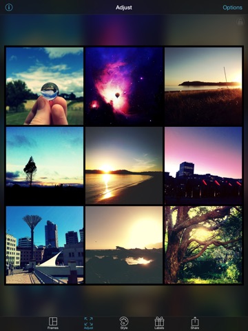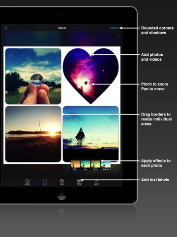 With over 100 frames, supporting up to 16 photos or videos, text labels, rounded corners, photo effects, shapes, shadows, music, plenty of patterns and an easy color picker you will always have a unique look.