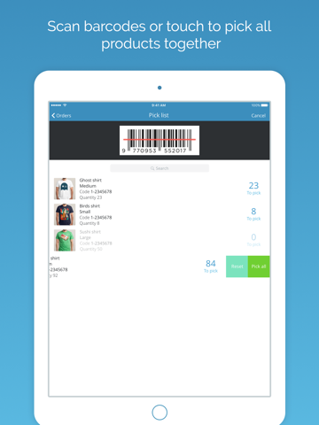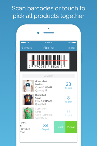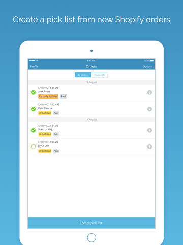 Pick Pack for Shopify is a free tool by TradeGecko to help you simplify your order fulfilment process. Sync with your Shopify store and see all outstanding orders to pick from your iPhone or iPad.