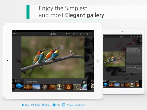 Une interface conviviale, rapide à utilise, un des rares logiciels à pouvoir ajouter des tags, mots clés à ses photos pour mieux les classer et mieux les retrouver dans son ipad. Synchronisation facile avec drop box et Picasa. À recommander au vu du prix très bas e on comparaison avec ses concurrents.