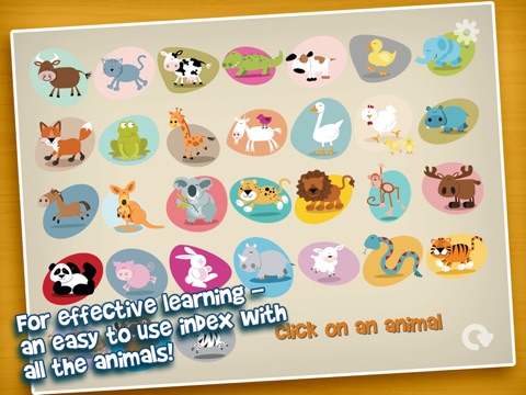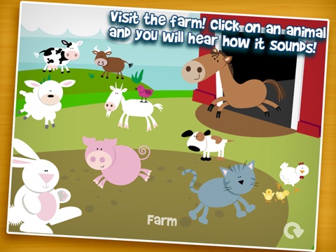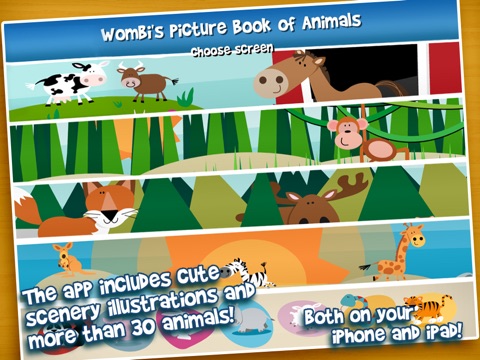 * Several scenery pictures such as “the Jungle”, “the Farm” or “the Woods” where many animals are presented together in one picture. This mode also includes sound and text for each animal. It is a fun game to find all the animals in the scenery!