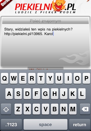 Dodatkowo użytkownik uzyskuje możliwość wysłania wpisów w formie linka do serwisu piekielni.pl lub treści wpisu jako wiadomość SMS lub wiadomość email