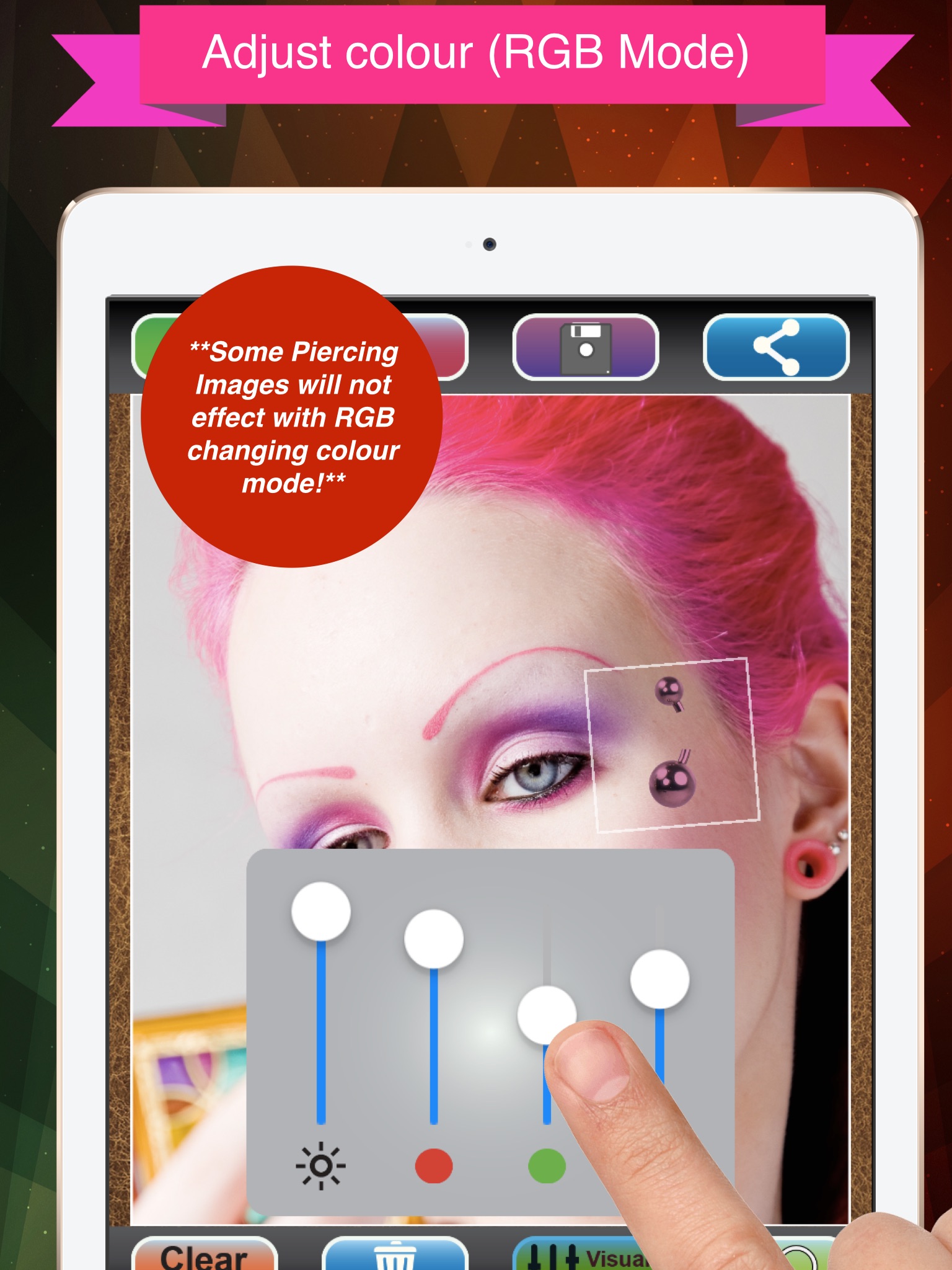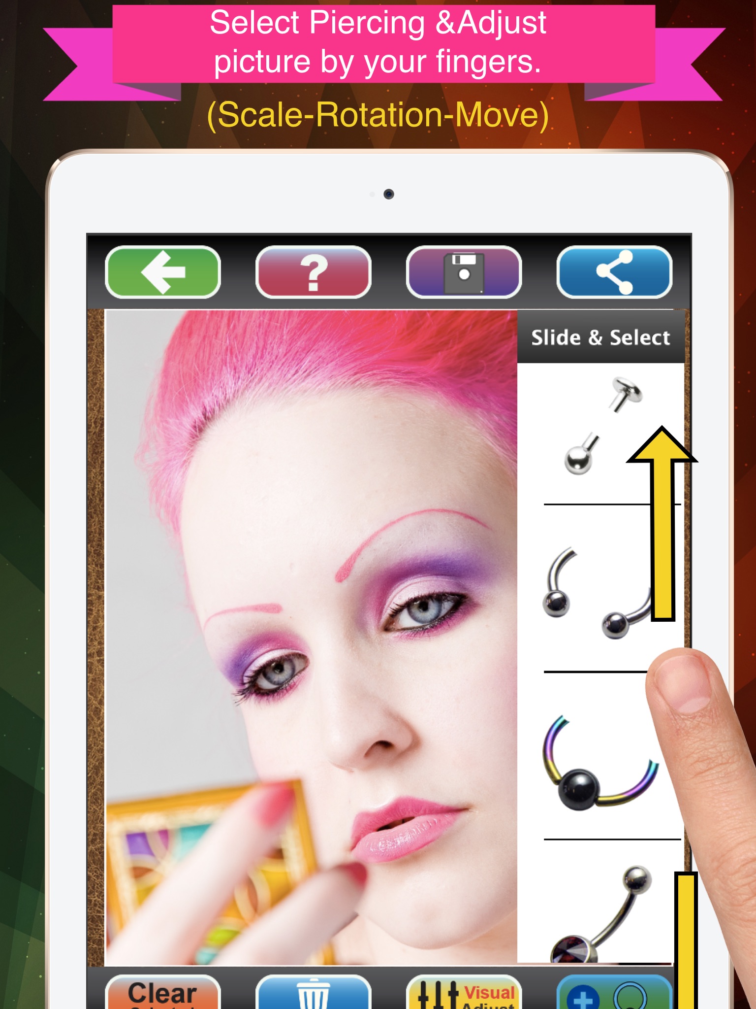 7. Tap "Visual Adjust Button" for open/close "Visual Adjust Panel" by this panel user can adjust color of piercing item.